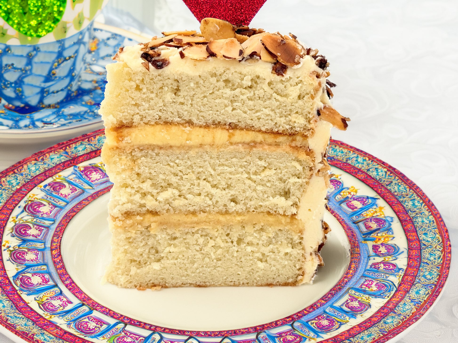 Queque de Almendra Caramelizada. Esta delicia cuidadosamente elaborada cuenta con capas perfectamente húmedas de queque de vainilla, enriquecidas con una suave crema de almendra y coronadas con nuestro exclusivo betún de Amaretto, terminado con un crujiente toque de almendras caramelizadas hechas a mano.